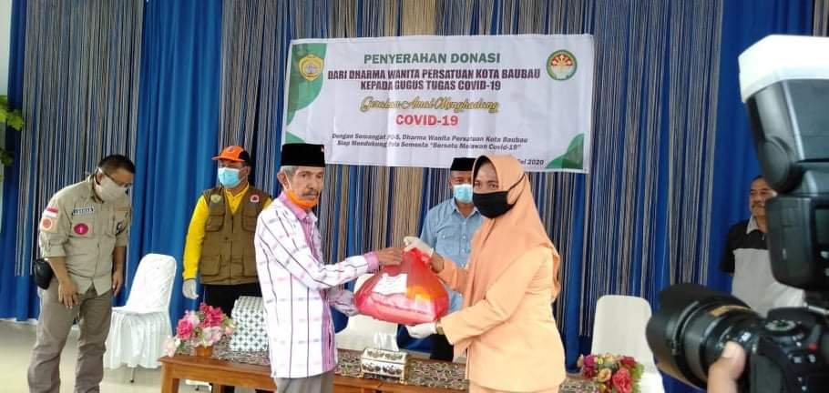 Darmawanita Persatuan (DWP) Kota Baubau menyerahkan donasi ratusan juta rupiah kepada tim gugus penanganan cepat Covid-19 Kota Baubau. Donasi senilai Rp 107 juta 700 ribu dan 77 karung beras ukuran 5 kilogram dengan nominal keseluruhan Rp. 111 juta 935 ribu ini, merupakan hasil gerakan amal menghadang Covid-19 para istri Aparatur Sipil Negara (ASN) Kota Baubau.