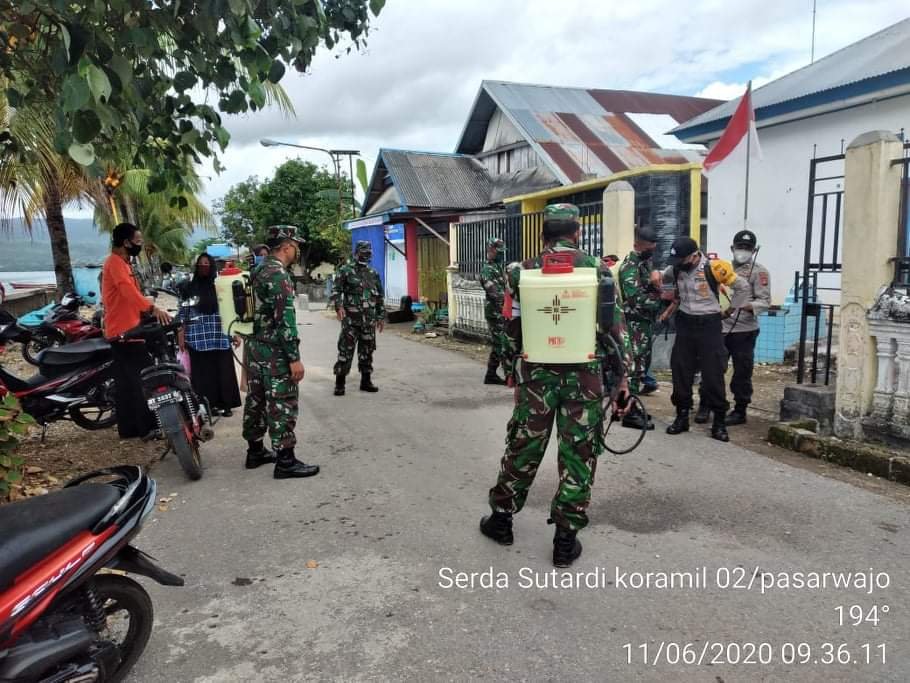 Personel Koramil 1413-02/Pasarwajo lakukan penyemprotan disinefektan di Kelurahan Pasarwajo, Kecamatan Pasarwajo, Kabupaten Buton. Hal ini sebagai upaya pencegahan virus corong di wilayah Kecamatan Pasarwajo Kabupaten Buton, Kamis 11 Juni 2020.
