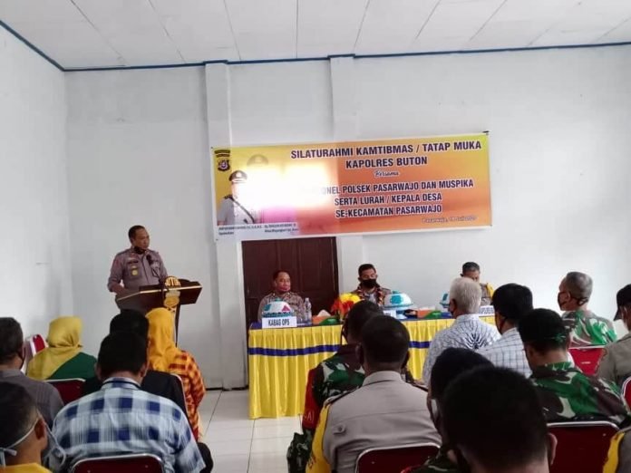 Penerapan protokol kesehatan menuju adaptasi kebiasaan baru. Kapolres Buton mengajak aparat desa dan camat se-Kecamatan Pasarwajo untuk mematuhi protokol kesehatan pemerintah tentang pencegahan penularan pandemi Covid-19, 18 Juli 2020.