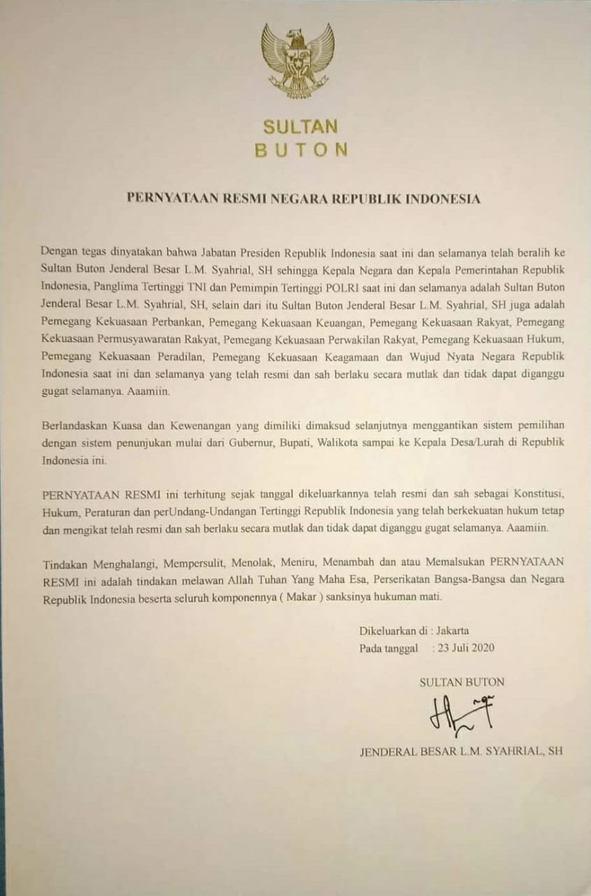 Jenderal gadungan LM Syahrial membuat pernyataan di atas kertas dan menyebarkannya di medsos (viral). Isinya, kekuasaan Presiden RI Jokowidodo telah beralih kepadanya sejak 23 Juli 2020.