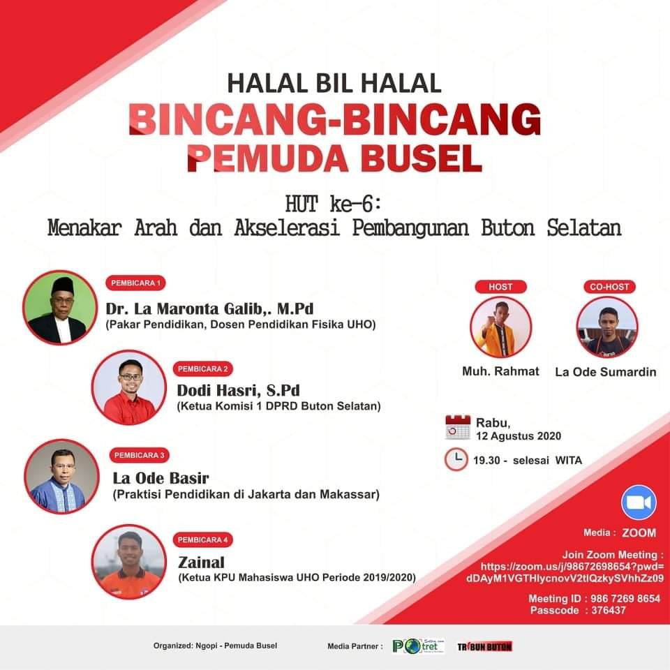 Pemuda Kabupaten Buton Selatan (Busel) menginisiasi Halal Bi Halal Bincang-bincang via zoom (virtual) dengan tajuk “Menakar Arah dan Akselerasi Pembangunan Buton Selatan.” Bincang-bincang ini diberi nama Ngobrol Positif Inspiratif (Ngopi) Pemuda Busel.