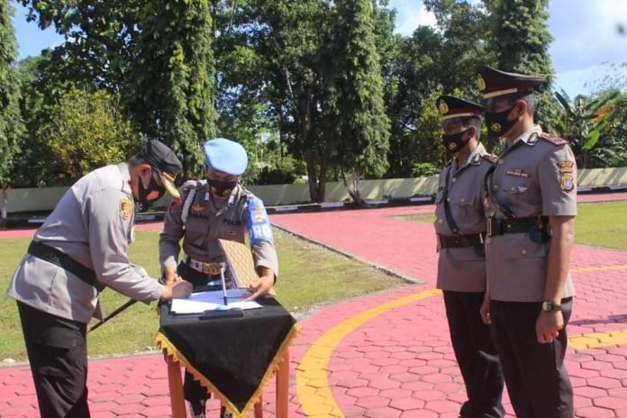 Kapolres Buton pimpin upacara serah terima jabatan 4 (Empat) Pejabat Utama Polres Buton, di halaman upacara Polres Buton, Rabu 19 Agustus 2020.