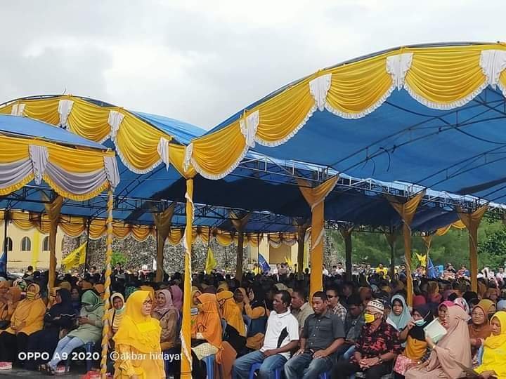 Amatan media ini, tampak kekompokkan ditunjukkan seluruh relawan Halo untuk Wangi-Wangi Selatan. Karena baru beberapa saat acara dimulai, hujan langsung turun mengguyur lokasi kegiatan. Namun relawan tidak bergeming dari tempat duduknya demi mendengarkan arahan Paslon.