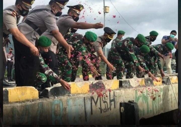 BUTON, TRIBUNBUTON.COM – Polres Buton menggelar upacara tabur bunga di Pelabuhan Banabungi, Kecamatan Pasarwajo, Kabupaten Buton, Kamis 1 Juli 2021. Hal itu dalam rangka memperingati Hari Bhayangkara ke-75.
