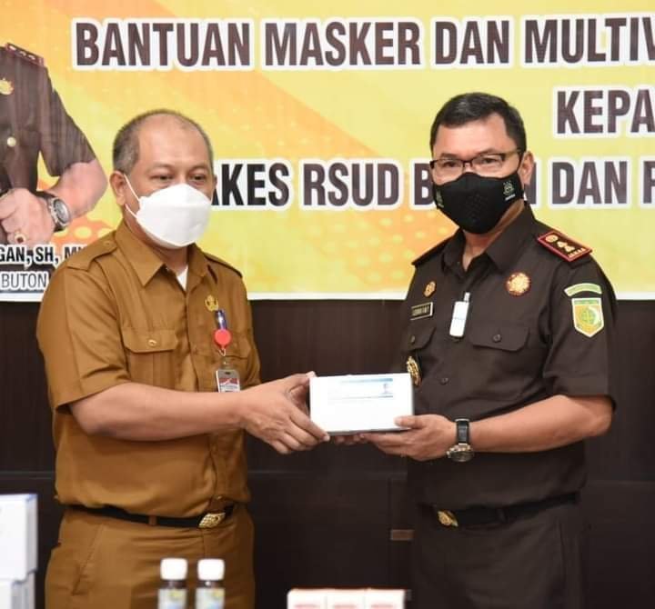 BUTON, TRIBUNBUTON.COM – Kepala Kejaksaan Negeri Buton, Ledrik VM Takaendengan SH MH, menyerahkan bantuan masker dan multivitamin kepada Tenaga Kesehatan (Nakes) RSUD Kabupaten Buton. Kegiatan yang bertajuk Adhiyaksa Peduli Covid-19, dilakukan di Kantor Kejaksaaan Pasarwajo, Senin, 9 Agustus 2021.
