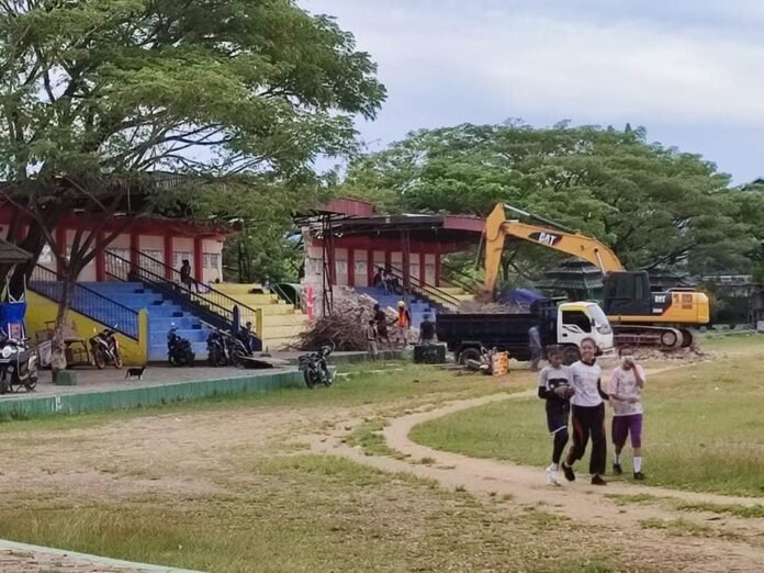 Tampak Eskavator sedang membongkar tribun eks Stadion Betoambari Baubau. FOTO: YUHANDRI HARDIMAN/TRIBUNBUTON.COM