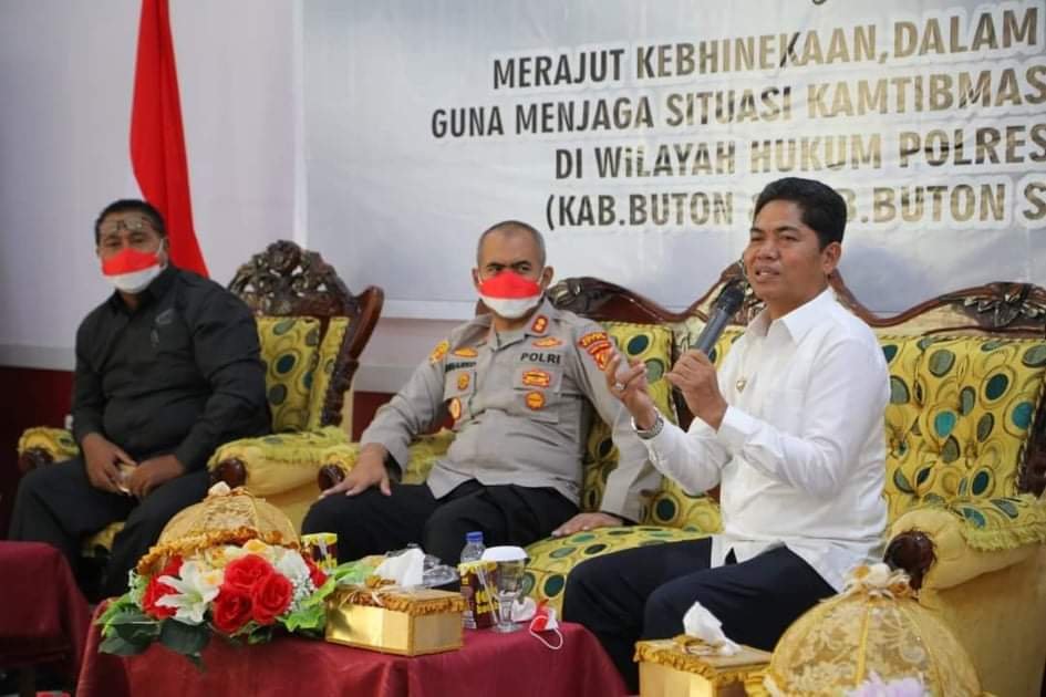 Bupati Buton, Drs La Bakry MSi, menjadi salah satu pembicara Sarasehan, Diskusi, dan Deklarasi Damai di Aula Endra Dharmalaksana Polres Buton, Rabu pagi 29 September 2021. Orang nomor satu di Buton tersebut mengatakan masyarakat tetap hidup damai dan kondusif karena begitu kuatnya penanaman nilai-nilai kearifan lokal dalam setiap kepribadian masyarakat Buton.