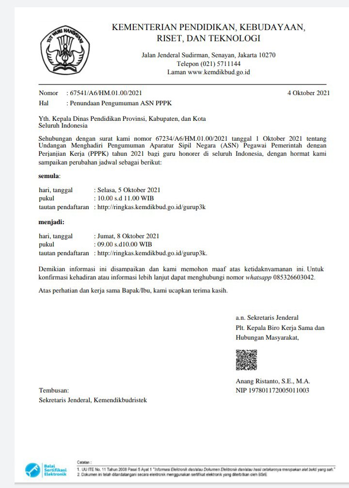 Surat Kementerian Pendidikan, Kebudayaan, Riset dan Teknologi RI terkait jadwal pengumuman hasil seleksi ASN-PPPK