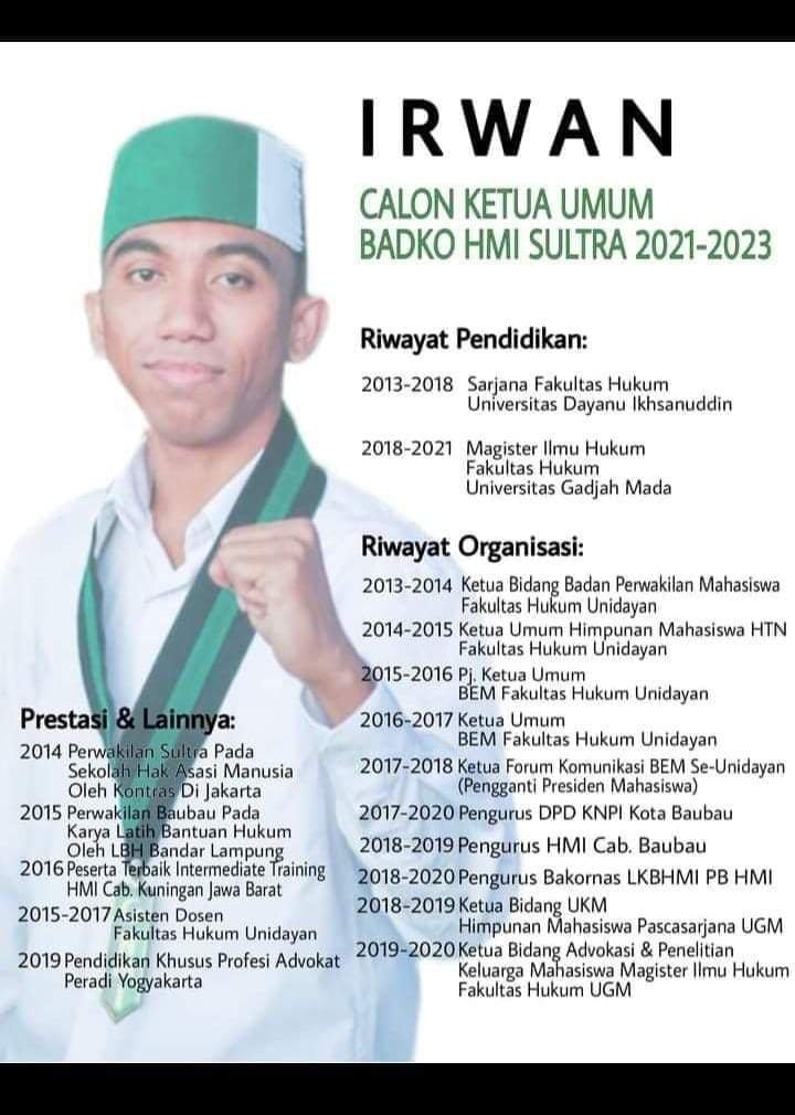 Irwan dibekali dengan berbagai prestasi baik akademik maupun non akademik, Irwan berkeyakinan dapat memberikan kontribusi terbaik dan maksimal untuk membangun dan meningkatkan kualitas badko HMI Sultra kedepannya. (p1)