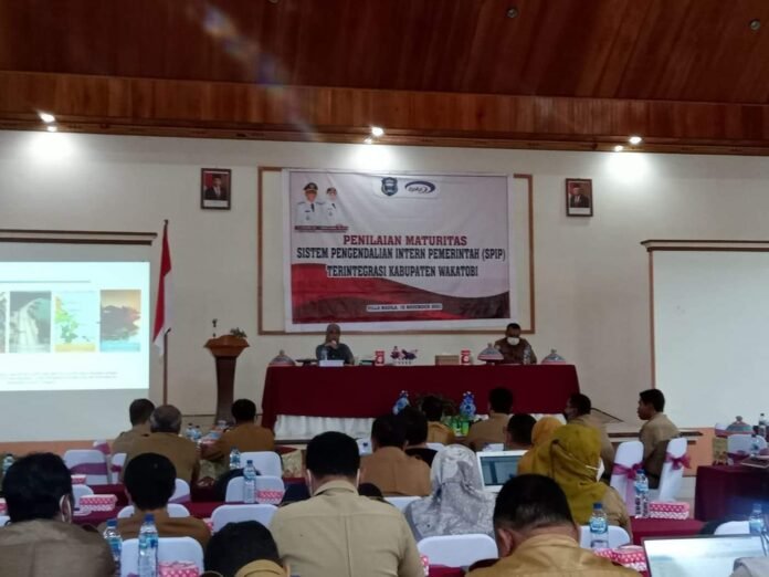 WAKATOBI, TRIBUNBUTON.COM – Pemerintah Daerah Kabupaten Wakatobi bersama Badan Pengawasan Keuangan dan Pembangunan (BPKP) menggelar penilaian maturitas Sistem Pengendalian Intern Pemerintah (SPIP) terintegrasi Kabupaten Wakatobi, di Vila Nadila, Kecamatan Wangi -wangi, Selasa 16 November 2021.