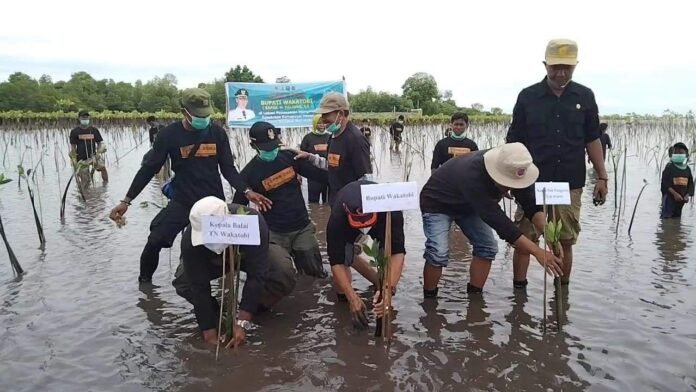 WAKATOBI, TRIBUN BUTON.COM – Balai Taman Nasional bersama Pemerintah Daerah (Pemda) Kabupaten Wakatobi, menggelar penanaman mangrove di Desa Horuo, Kecamatan Kaledupa. Sebanyak 210 ribu mangrove ditanam di area 75 hektare, Minggu 26 Desember 2021.