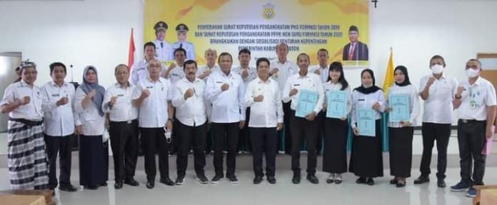 BUTON, TRIBUNBUTON.COM – Sebanyak 194 Pegawai Negeri Sipil (PNS) formasi 2019 dan 20 Pegawai Pemerintah dengan Perjanjian Kerja (P3K) non guru 2021 lingkup Pemkab Buton menerima Surat Keputusan (SK) PNS (100 persen).