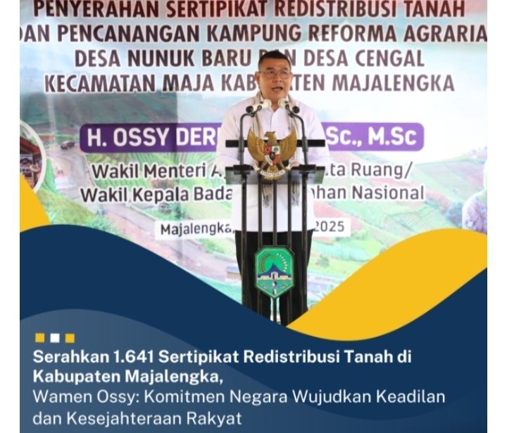 MAJALENGKA, TRIBUNBUTON.COM – Sebanyak 1.641 sertipikat program Redistribusi Tanah milik warga di Kabupaten Majalengka Jawa Barat. Diserahkan secara simbolik oleh Wakil Menteri Agraria dan Tata Ruang/Badan Pertanahan Nasional (Wamen ATR/BPN), Ossy Dermawan. Kamis 13 Februari 2025.