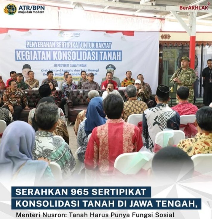 Nusron Wahid, di depan masyarakat penerima sertipikat pada kesempatan itu menyampaikan terkait pentingnya fungsi sosial tanah dan akses jalan sebagai bagian dari prinsip keadilan dalam pemanfaatan lahan.