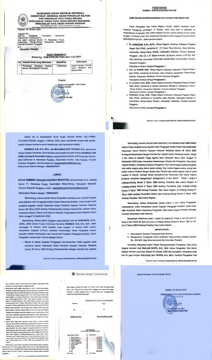 Dalam surat pengantar PTUN Kendari Tertanggal 28 Oktober 2028 yang ditanda tangani Panitera Pengadilan Tata Usaha Negara Kendari, Taufiq SH.MH dan Ketua PTUN Kendari yang ditujukan kepada Ketua Pembina Yayasan Hasanah Wakatobi selaku pihak tergugat, Nomor 501/PAN.PTUN.W4-TUN3/HK2.7/X/2025. Dijelaskan Penetapan Dismissal Perkara Nomor 26/G/2025/PTUN.KDI. Dikirim dengan hormat untuk diketahui dan dilaksanakan.