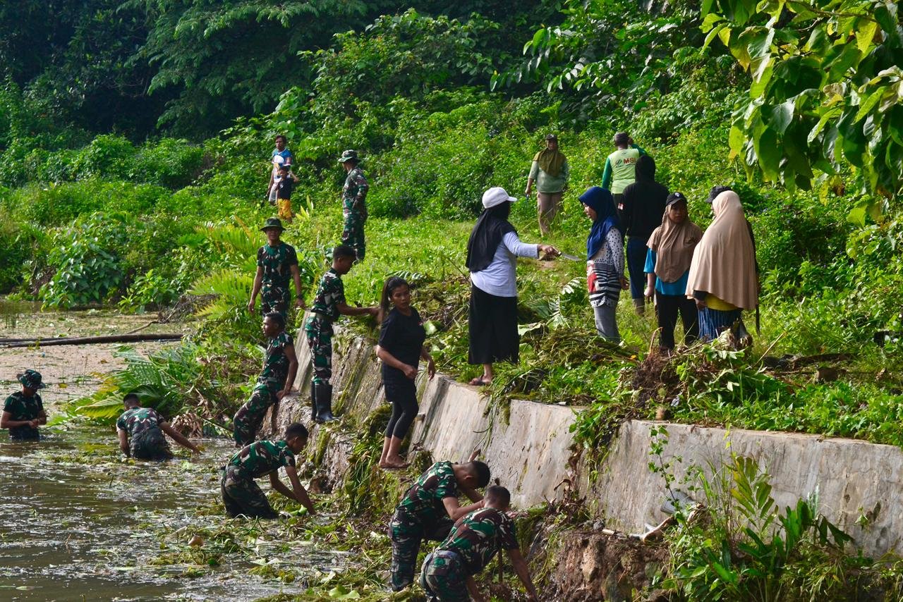 Sekitar 100 prajurit Yonif TP 823/Raja Wakaaka bersama 50 warga Kelurahan Kaisabu Baru melaksanakan pembersihan cekdam (bendungan) yang menjadi sumber pengairan sawah dan ladang warga.