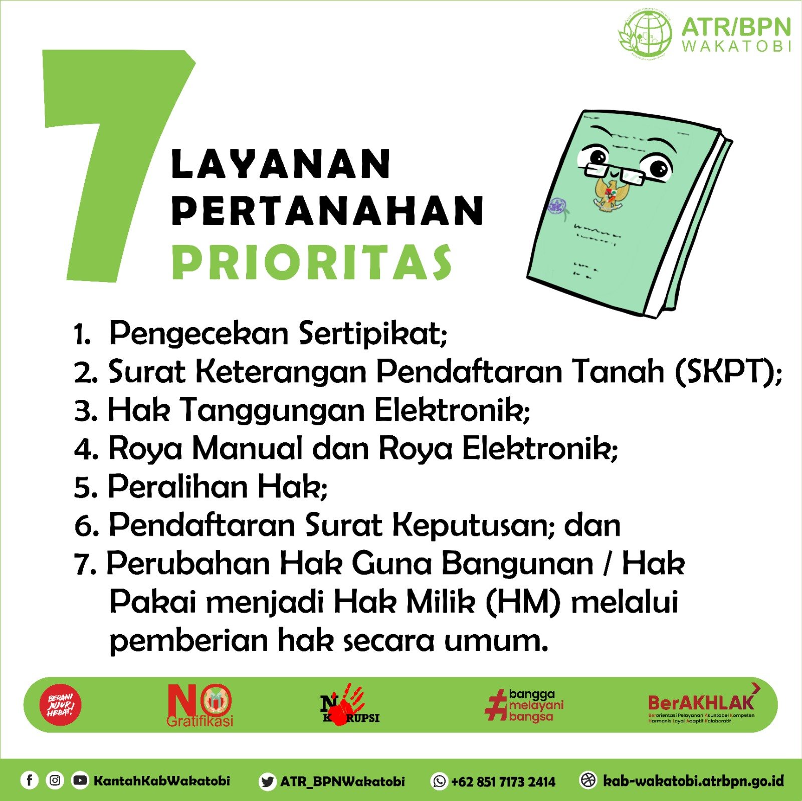 WAKATOBI, TRIBUNBUTON.COM – Dalam upaya memperkuat komitmen terhadap pelayanan publik yang transparan dan akuntabel, Kantor Pertanahan Kabupaten Wakatobi terus menggencarkan implementasi Tujuh Layanan Pertanahan Prioritas.
